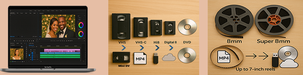 WHETHER IT’S VIDEO EDITING THAT YOU NEED, OR YOU HAVE BOXES OF PRECIOUS VIDEO TAPES OR 8MM FILM REELS THAT YOU WANT TO PRESERVE, WE CAN HELP! CLICK ON THE SERVICE THAT YOU NEED FOR MORE INFO. VIDEO EDITING TAPE TO DIGITAL FILM TO DIGITAL